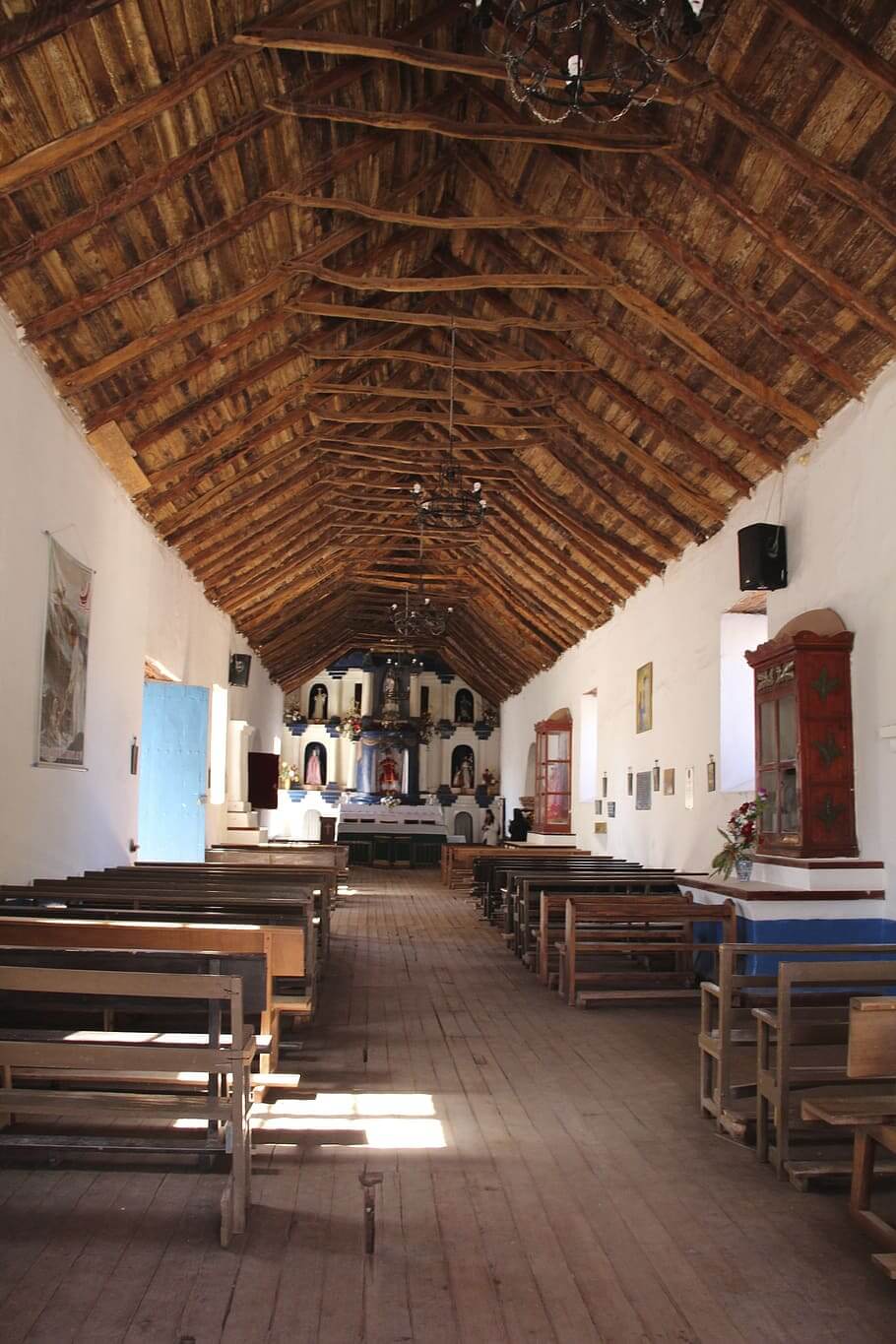 Inside the churches, the altars and retables stand out as the most striking elements. Made from adobe, carved stone, or wood, these altars are vibrant and baroque in style, housing images from the renowned Quito and Cuzco schools and workshops from Lima, Potosí, and Chiloé. Most churches feature a single nave, with lateral chapels a rare addition. Solid buttresses often reinforce the walls, ensuring the structures' stability.