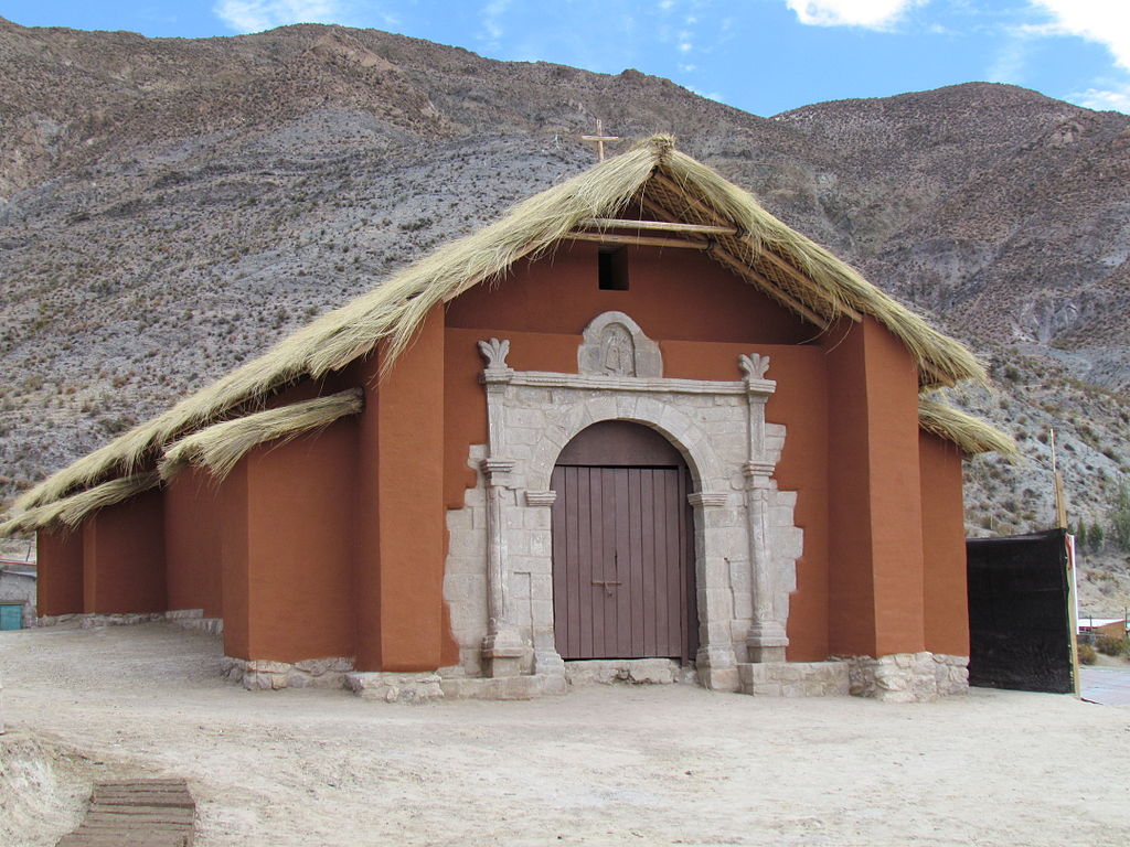 The churches of the Altiplano were constructed using local materials such as adobe, stone, mud, wild straw (coirón), and Indigenous wood. These materials were combined using rudimentary techniques that reflected each location's geographic, productive, and social characteristics. The churches typically feature low, two-slope roofs and small towers, either attached to the main building or within the atrium, housing centenary bells.